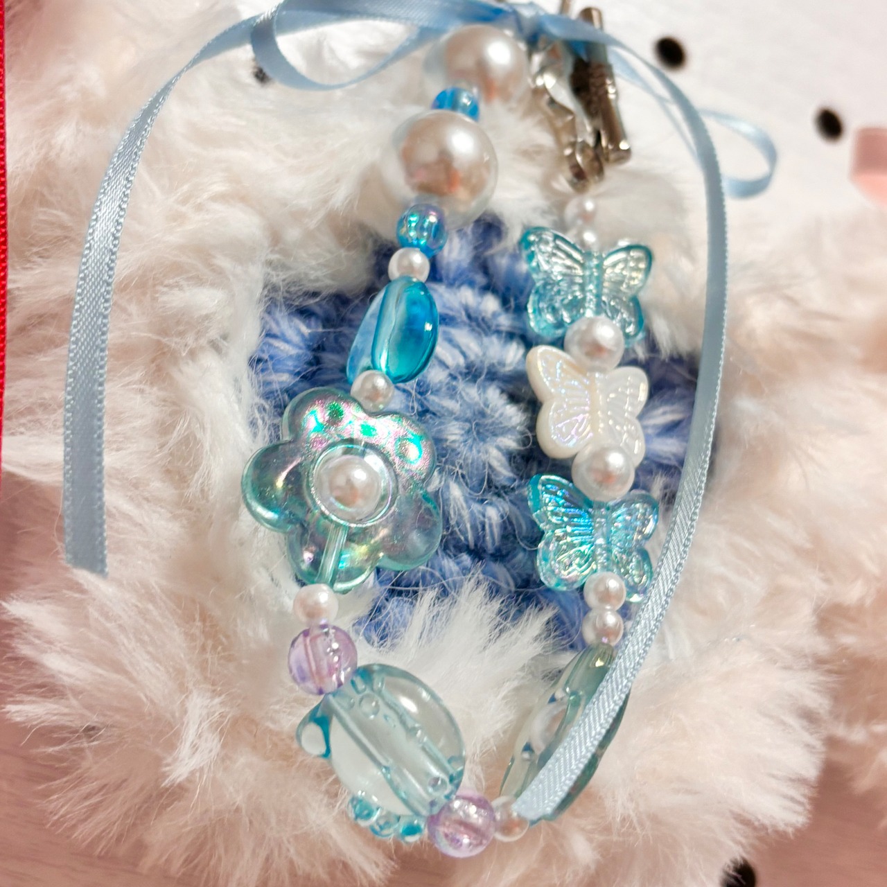 モチーフの色合いに合わせたビーズブレスレット付き